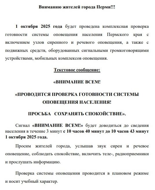 планируется 1 октября 2025 г. провести комплексную проверку готовности региональной, муниципальных и локальных систем оповещения населения Пермского края, в том числе в городе Перми, с запуском электросирен (громкоговорителей), замещением эфира общероссийских общедоступных телеканалов (радиоканалов) и доведением проверочных сигналов и информации до населения.